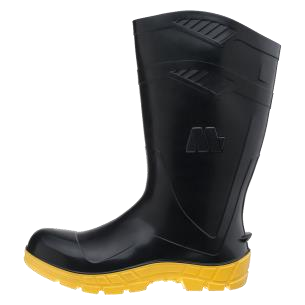 Bota ocupacional de cano longo tipo D, classificação II, impermeável, confeccionada em material polimérico (PVC), sem forração interna, na cor preta com solado amarelo.