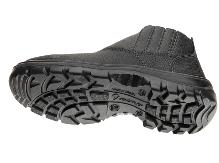Botina ocupacional com biqueira de plástico, dorso acolchoado, confeccionada em couro, fechamento em elástico nas laterais, forração interna e solado bidensidade.